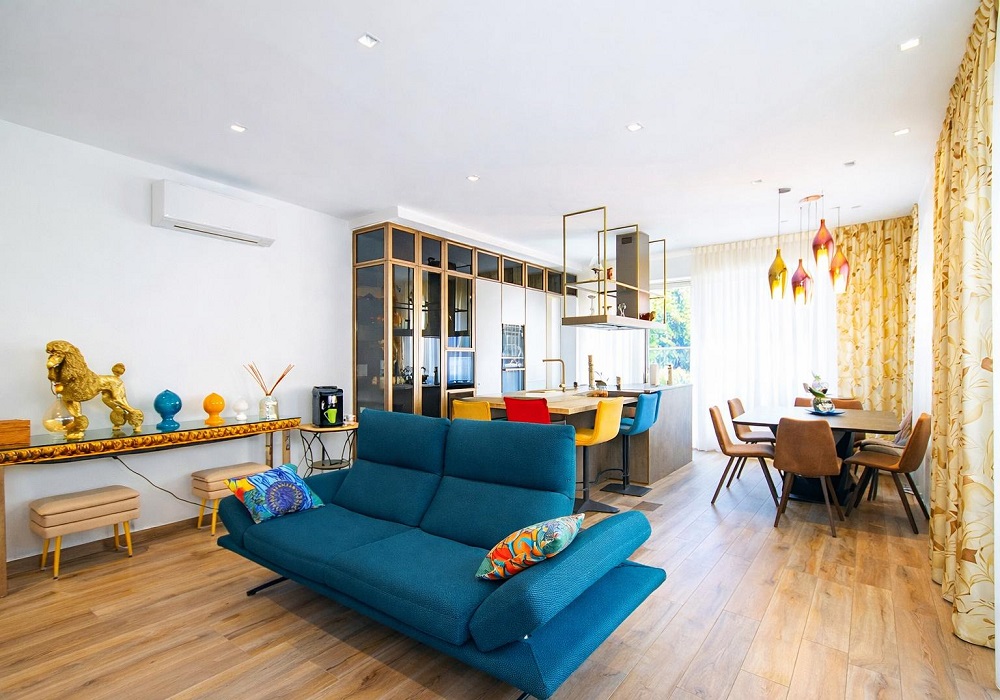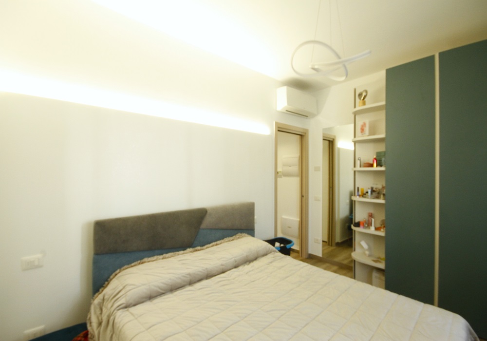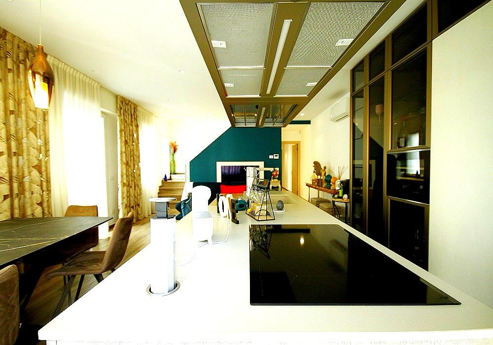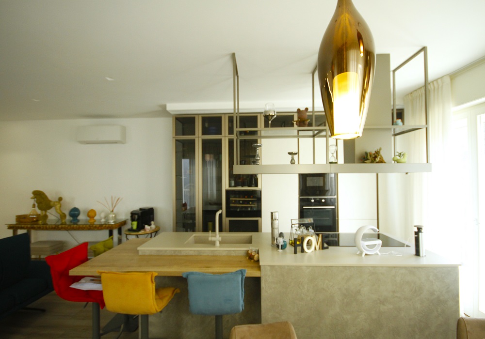 Il soggiorno accoglie con arredi moderni dai colori vivaci ed elementi decorativi ricercati; l’ampia cucina a vista presenta isola centrale con piano snack dotato di sedute colorate, elettrodomestici incassati all’avanguardia e finiture materiche contemporanee.