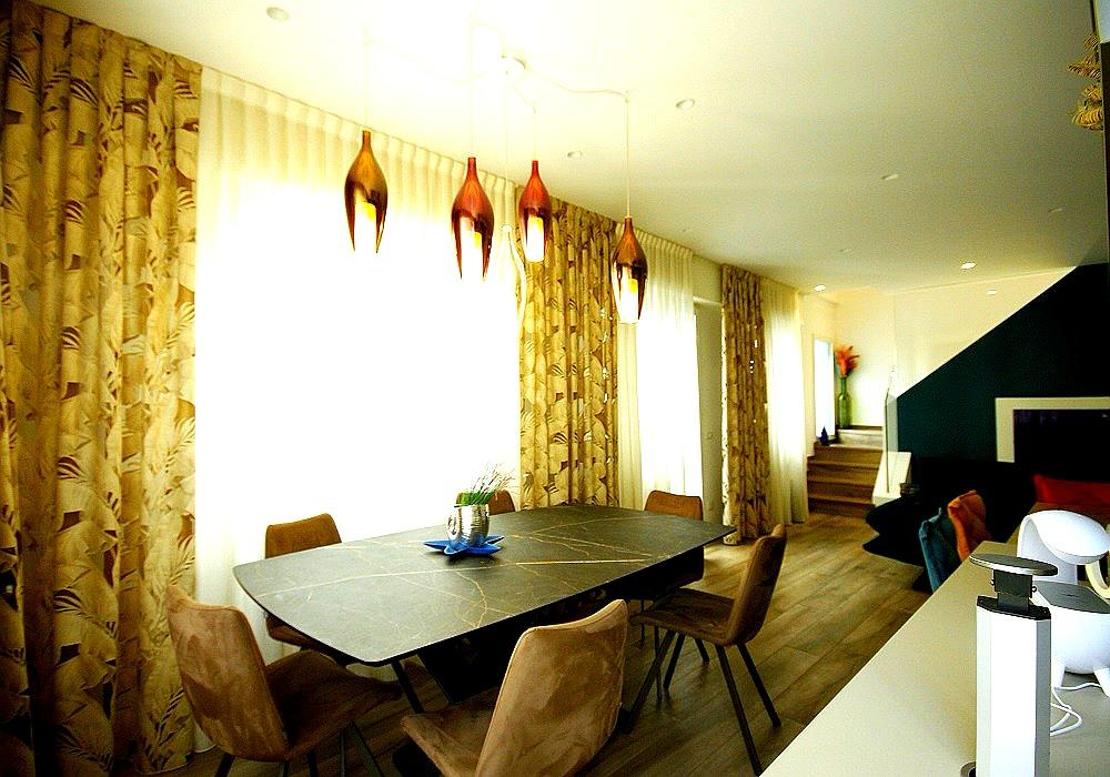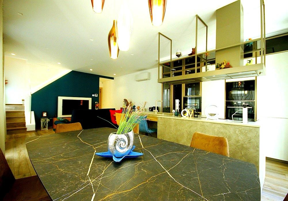 La zona pranzo ospita un elegante tavolo in marmo scuro circondato da comode poltroncine imbottite dal design moderno sotto raffinate lampade sospese dorate e ramate.