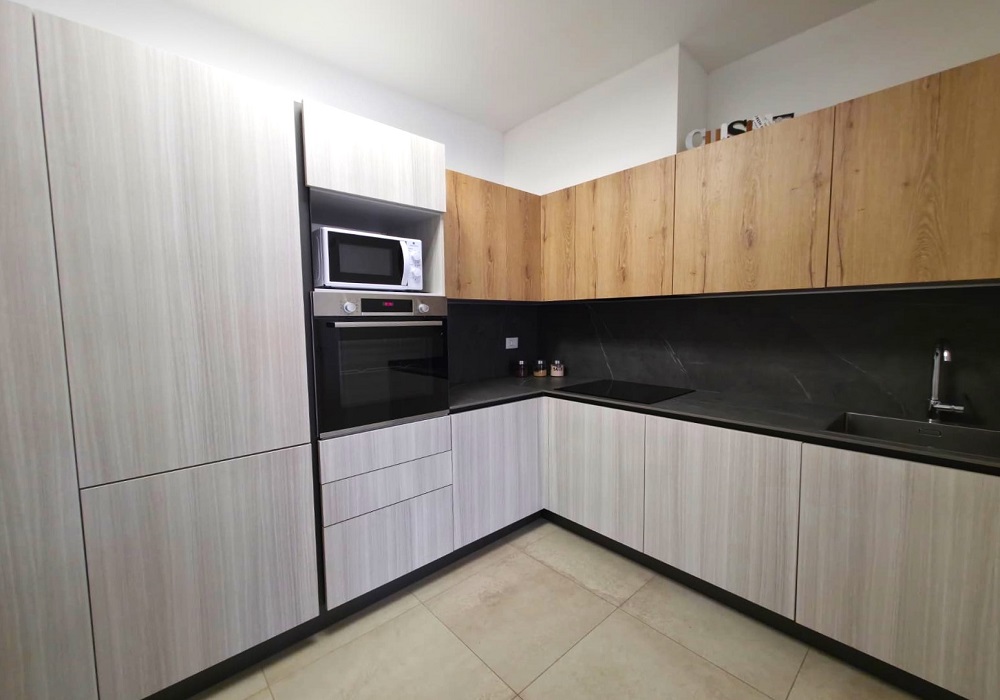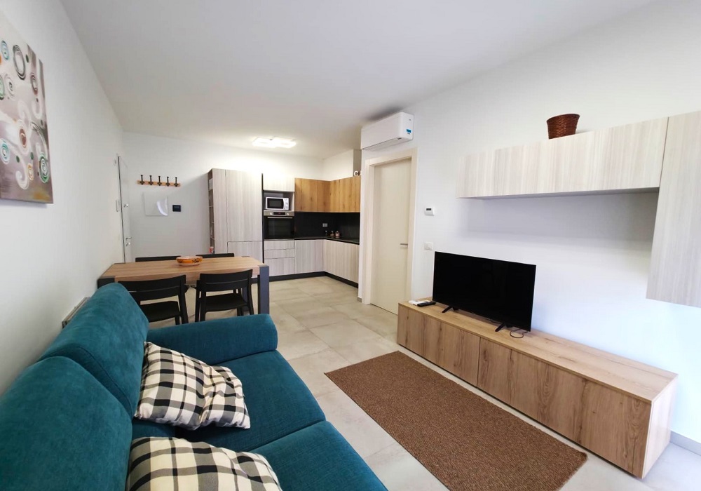 L’appartamento è caratterizzato da una zona living openspace molto luminosa grazie alle grande vetrata del soggiorno che affaccia su uno splendido balcone abitabile perfetto per pranzi all’aperto o momenti di relax. La zona openspace comprende una cucina moderna completamente attrezzata con mobili dal design contemporaneo effetto legno chiaro/scuro ed elettrodomestici incassati con una comoda area pranzo, divano color petrolio con cuscini decorativi ed elegante mobile TV sospeso.